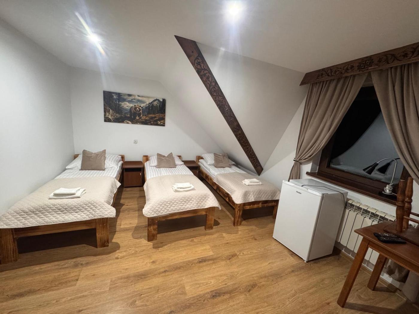 Pokój trzyosobowy z balkonem. This triple room is comprised of a flat-screen TV with satellite channels, a private bathroom as well as a balcony with mountain views. The unit has 2 beds. Pokój Trzyosobowy - 3 osobowy. Powierzchnia pokoju ok.: 16 mkw. ;