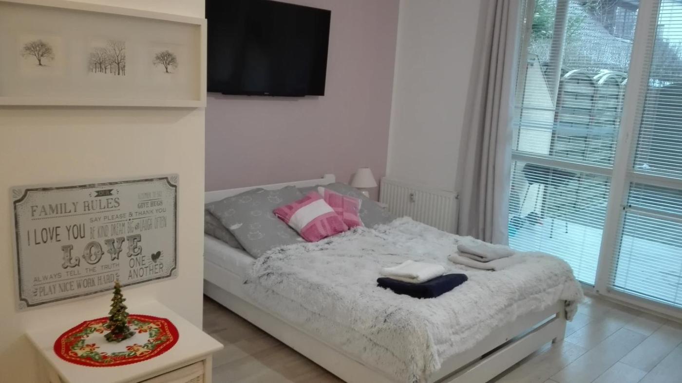Apartament z tarasem. This apartment comes with 1 bedroom, kitchenette, a terrace and 1 bathroom with a walk-in shower. The fully equipped kitchenette has a stovetop, a refrigerator, kitchenware and a microwave. The apartment features a washing machine, a tea and coffee maker, a dining area, a flat-screen TV, as well as garden views. The unit has 2 beds. Apartament - 4 osobowy. Powierzchnia pokoju ok.: 30 mkw.