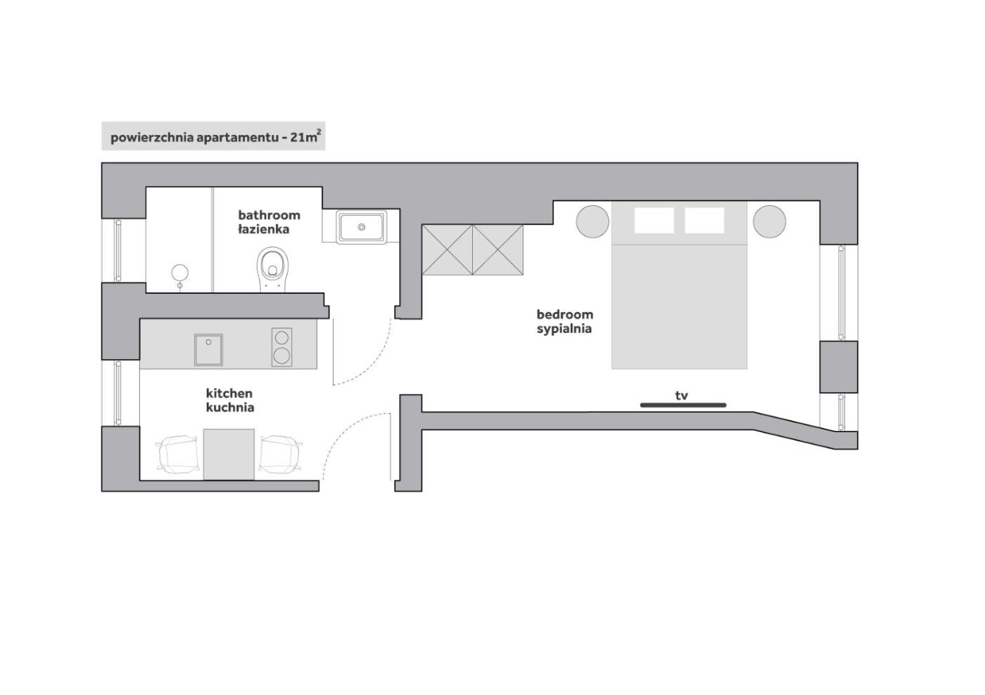 Apartament typu studio. The apartment has 1 bedroom and 1 bathroom with a walk-in shower and free toiletries. In the well-equipped kitchenette, guests will find a stovetop, a refrigerator, a dishwasher and kitchenware. The apartment offers a flat-screen TV with cable channels, a washing machine, a tea and coffee maker, a dining area as well as a quiet street view. The unit has 1 bed. Apartament - 2 osobowy. Powierzchnia pokoju ok.: 21 mkw. ;